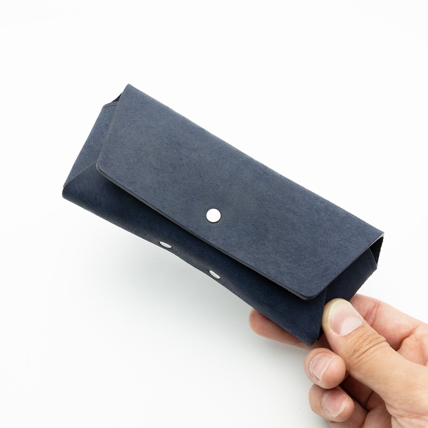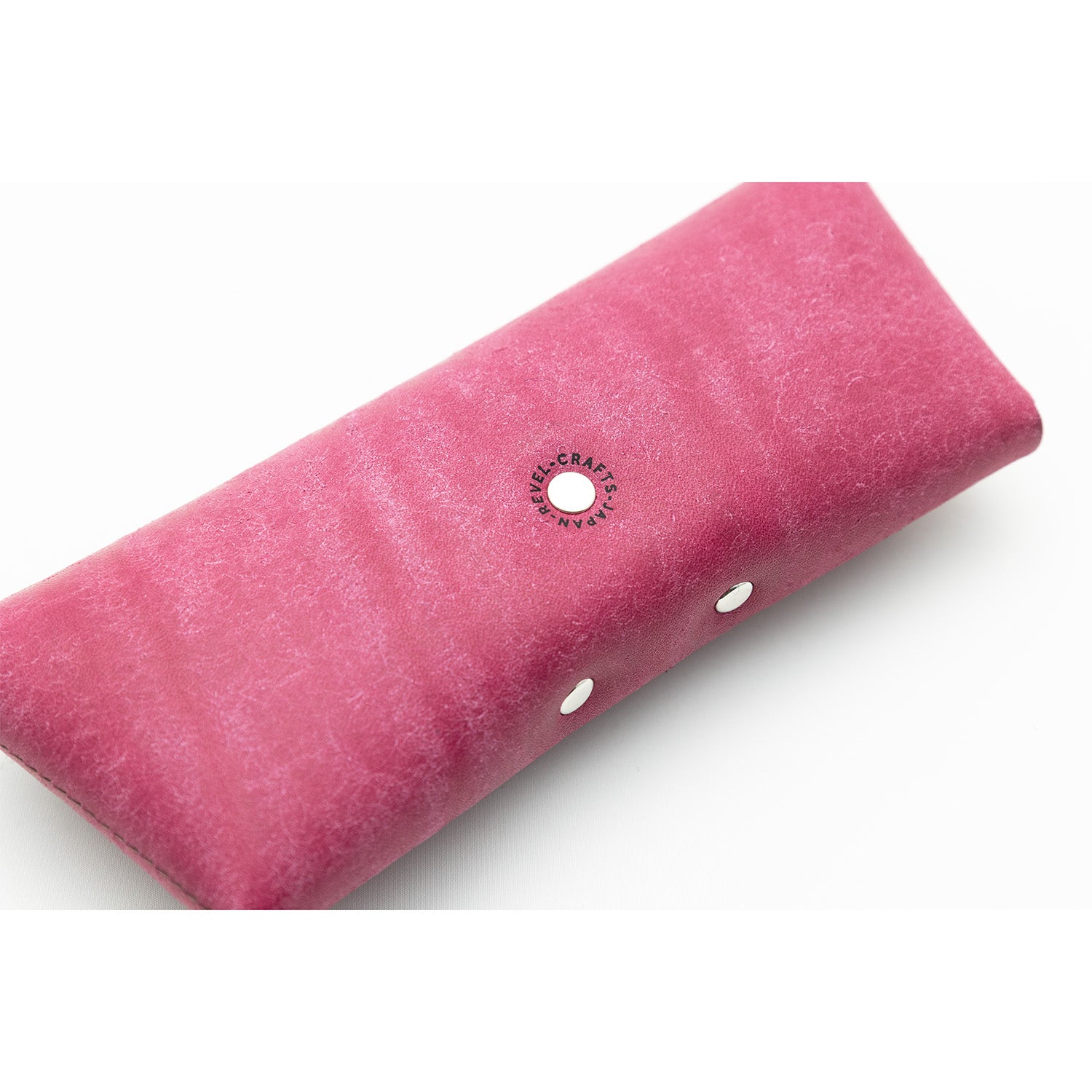 本革のメガネケースは世の中あまり種類がなく決まったデザインの物が多いですが、REVELでh折革製法を最大限活かし、羽織をイメージした独特のフォルムに仕立てました。製品の縁に縫い代がないので手にもった時に丸みのあるコンパクトなサイズ感になっています。