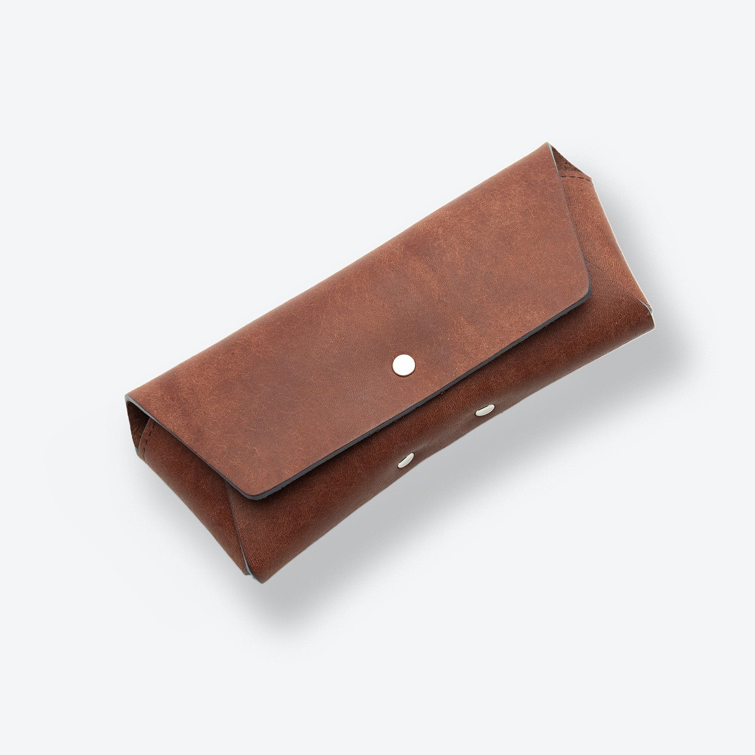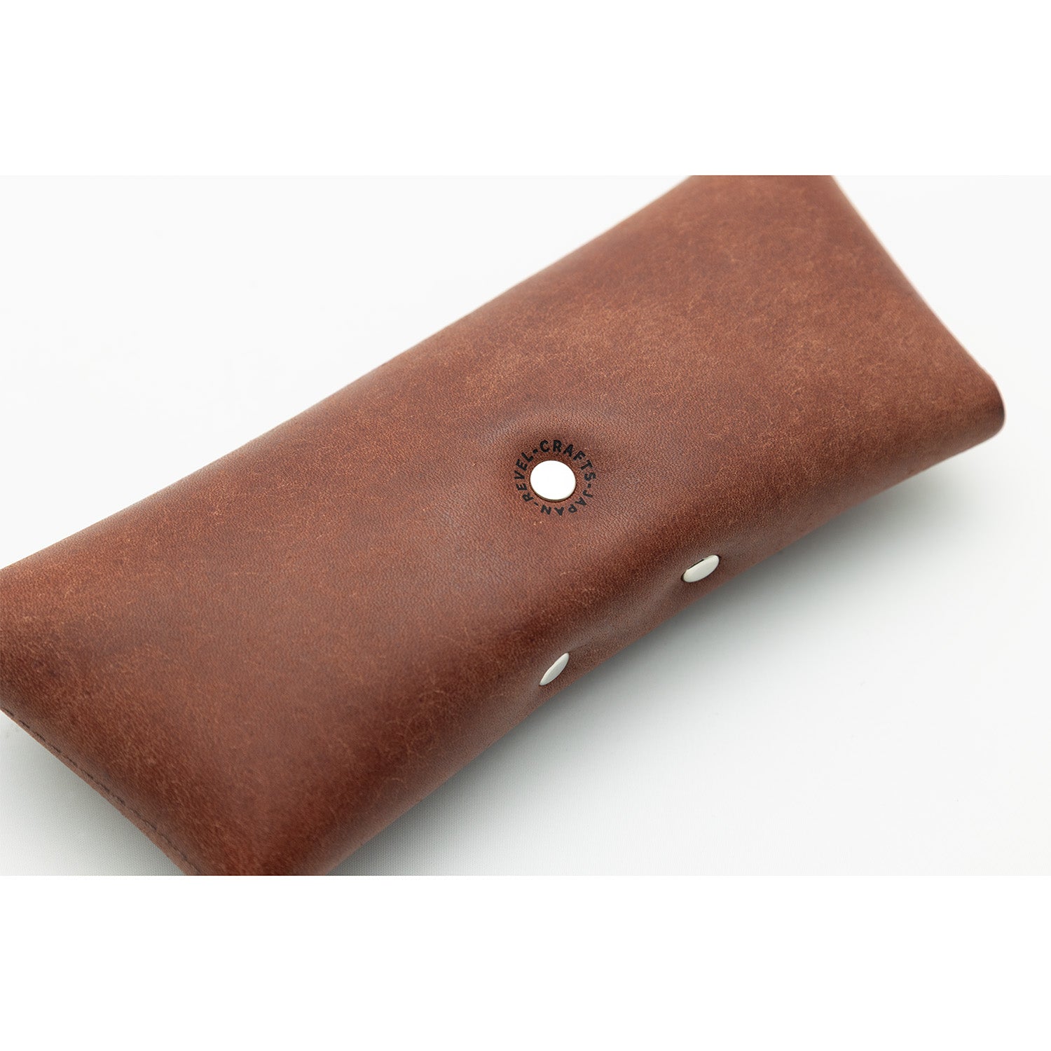 本革のメガネケースは世の中あまり種類がなく決まったデザインの物が多いですが、REVELでh折革製法を最大限活かし、羽織をイメージした独特のフォルムに仕立てました。製品の縁に縫い代がないので手にもった時に丸みのあるコンパクトなサイズ感になっています。