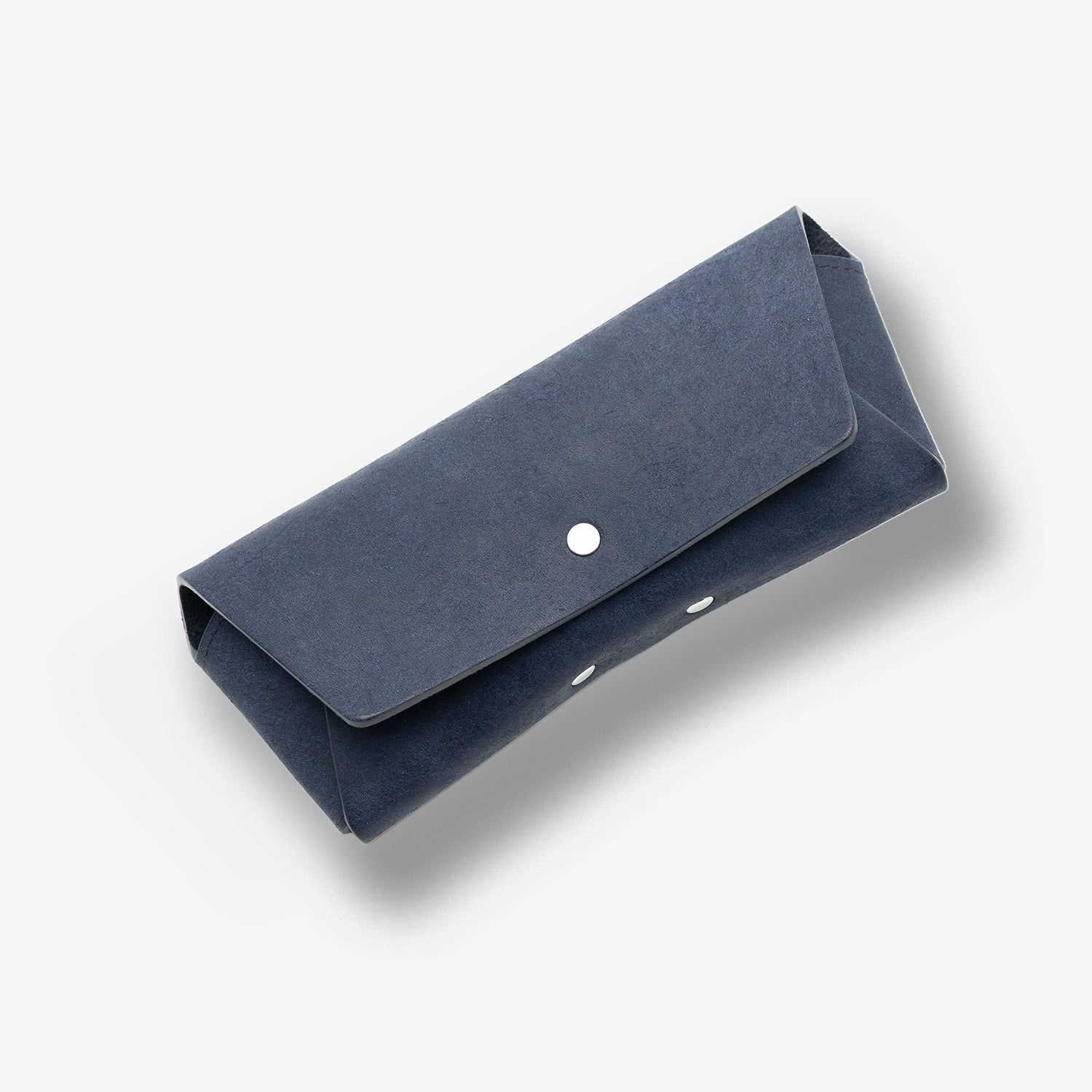 本革のメガネケースは世の中あまり種類がなく決まったデザインの物が多いですが、REVELでh折革製法を最大限活かし、羽織をイメージした独特のフォルムに仕立てました。製品の縁に縫い代がないので手にもった時に丸みのあるコンパクトなサイズ感になっています。