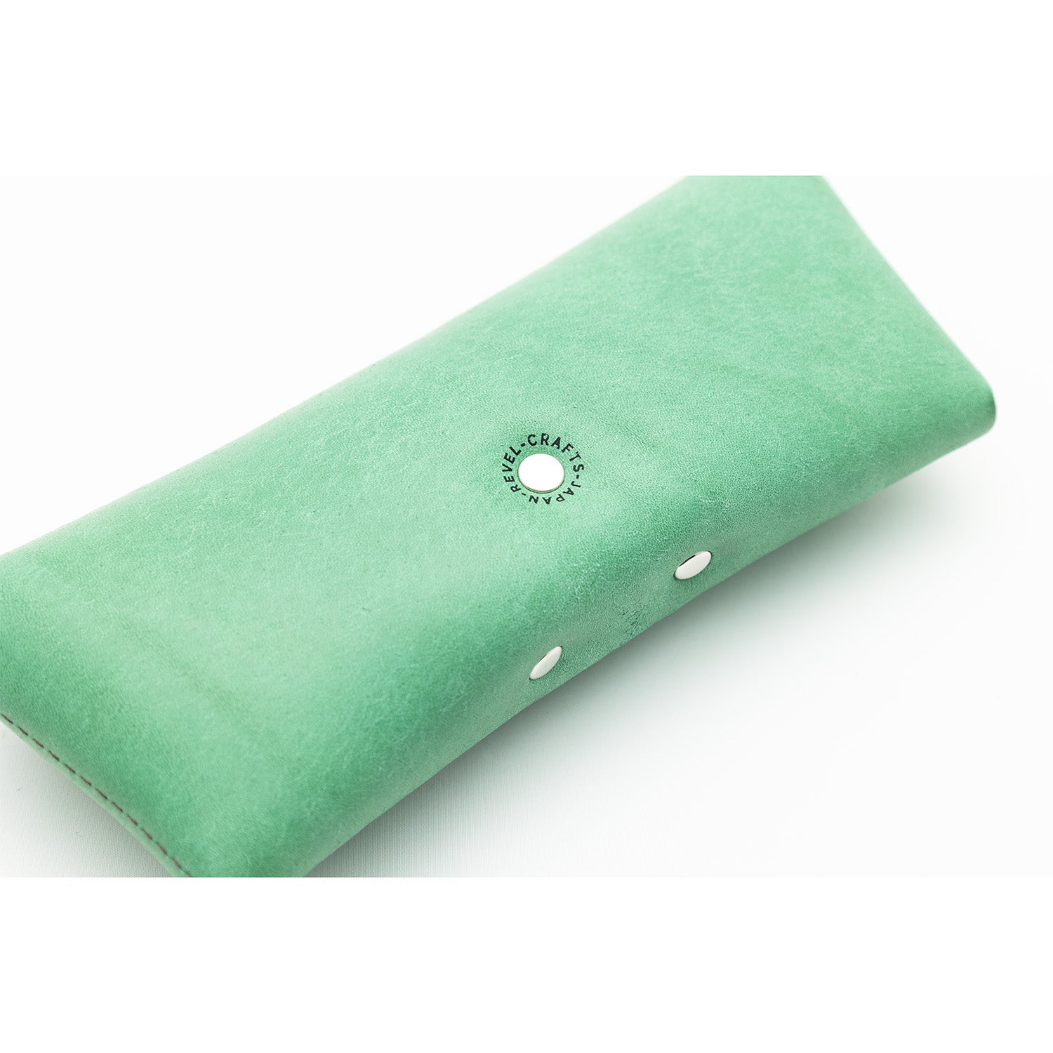 本革のメガネケースは世の中あまり種類がなく決まったデザインの物が多いですが、REVELでh折革製法を最大限活かし、羽織をイメージした独特のフォルムに仕立てました。製品の縁に縫い代がないので手にもった時に丸みのあるコンパクトなサイズ感になっています。