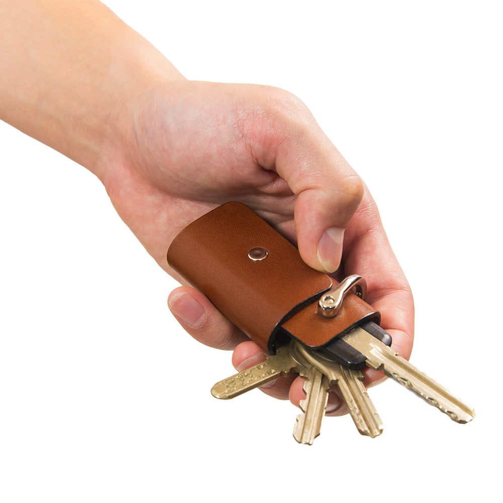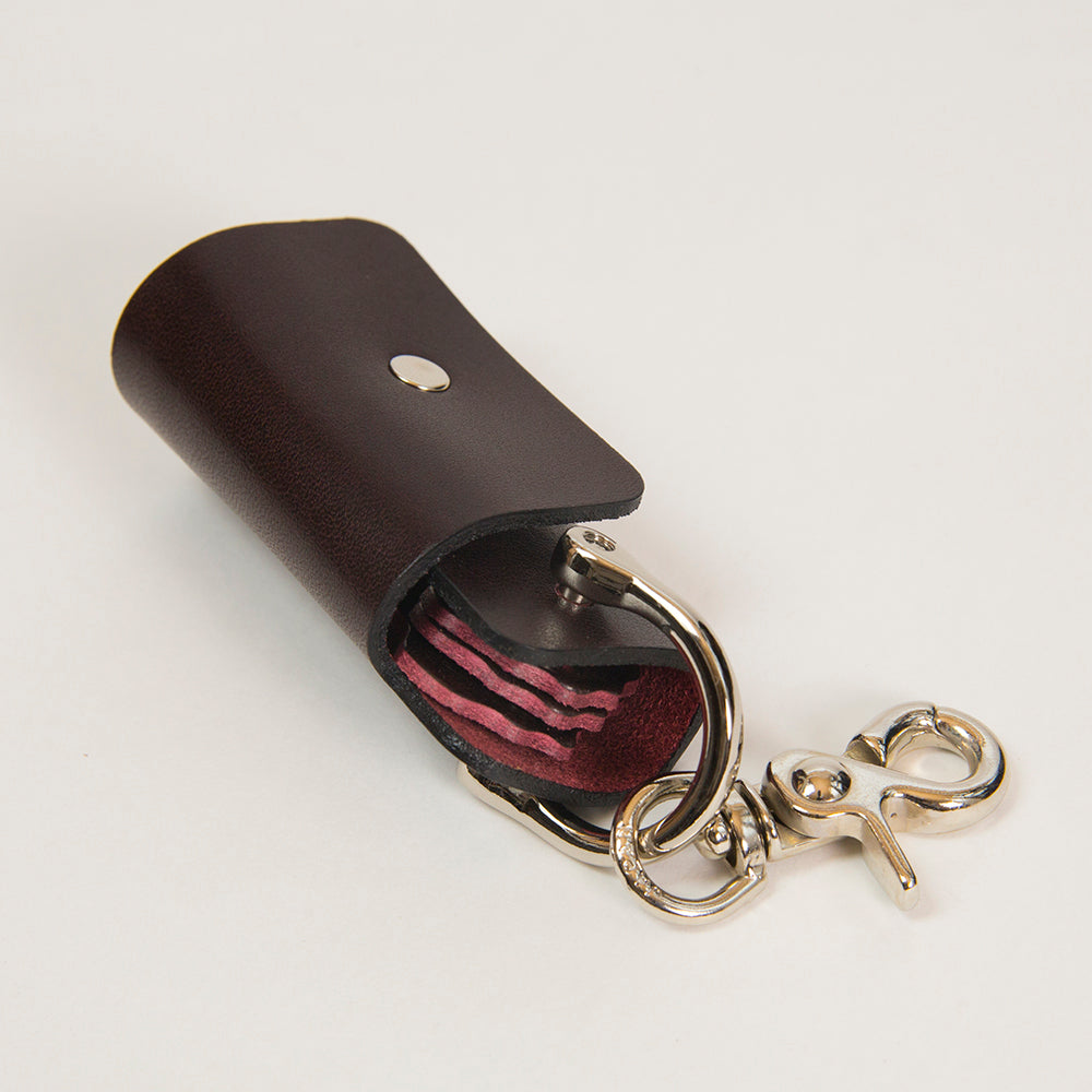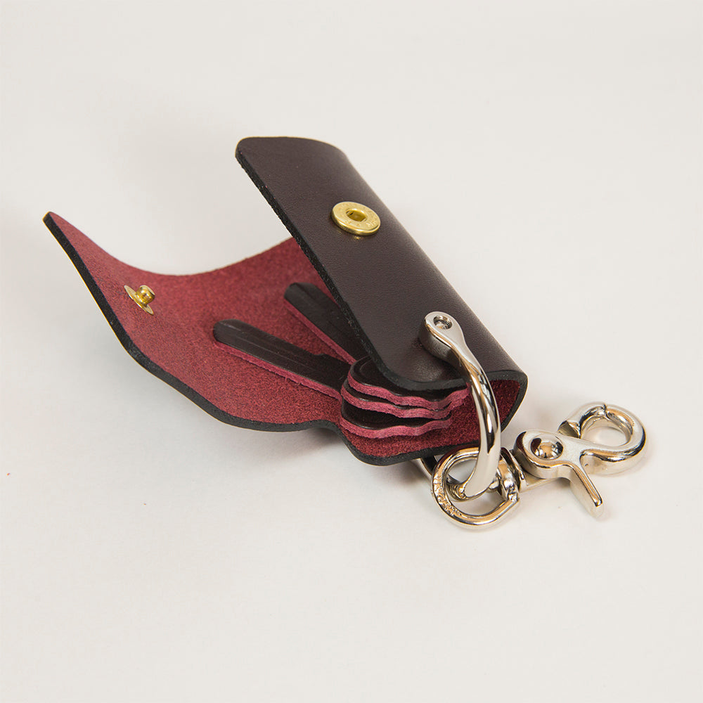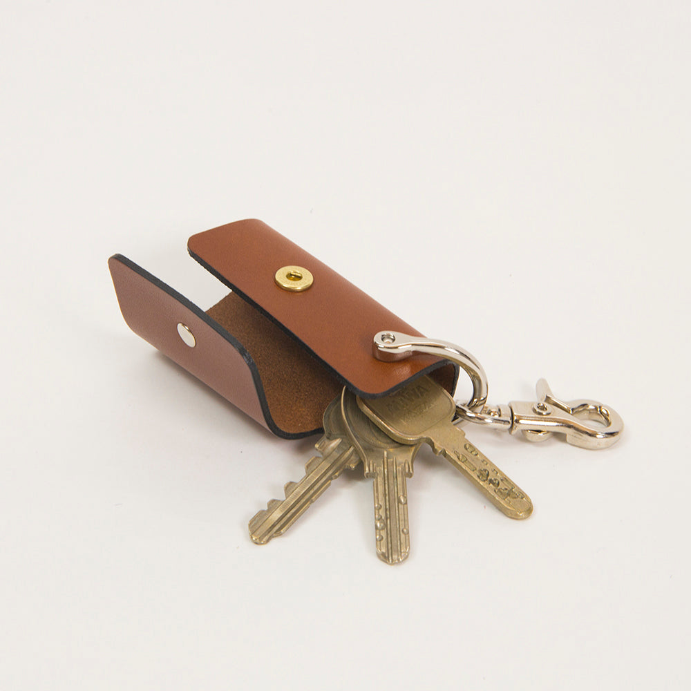 「シャックル」と呼ばれる作業現場などで使われている金具を服飾用にアレンジしており、ネジ棒に鍵を通して1枚の革で包み込む構造になっています。様々な場所に取り付けができるようにナスカンフックもついています。一般的なサイズの鍵で約4本程度装着できます。今までにない驚くほどに小さなキーケースです。