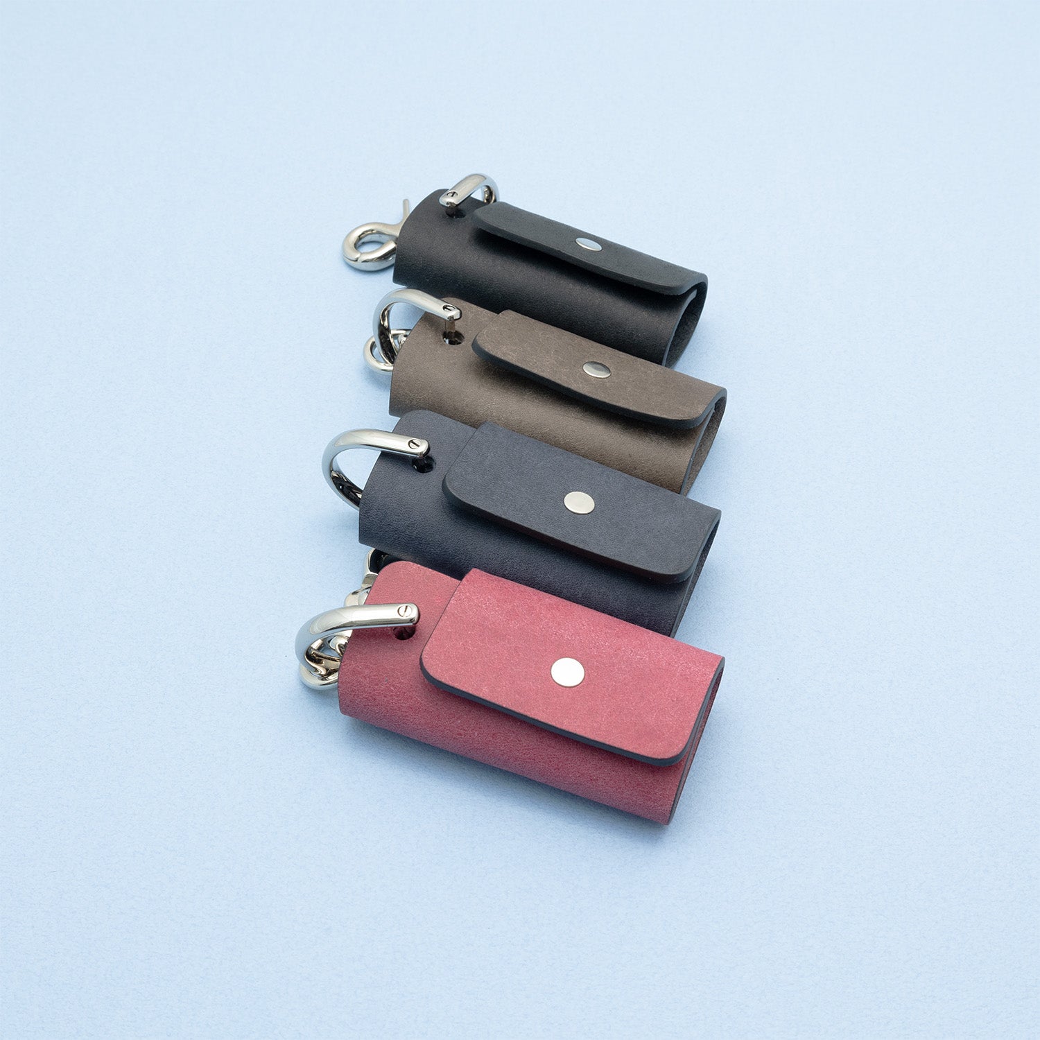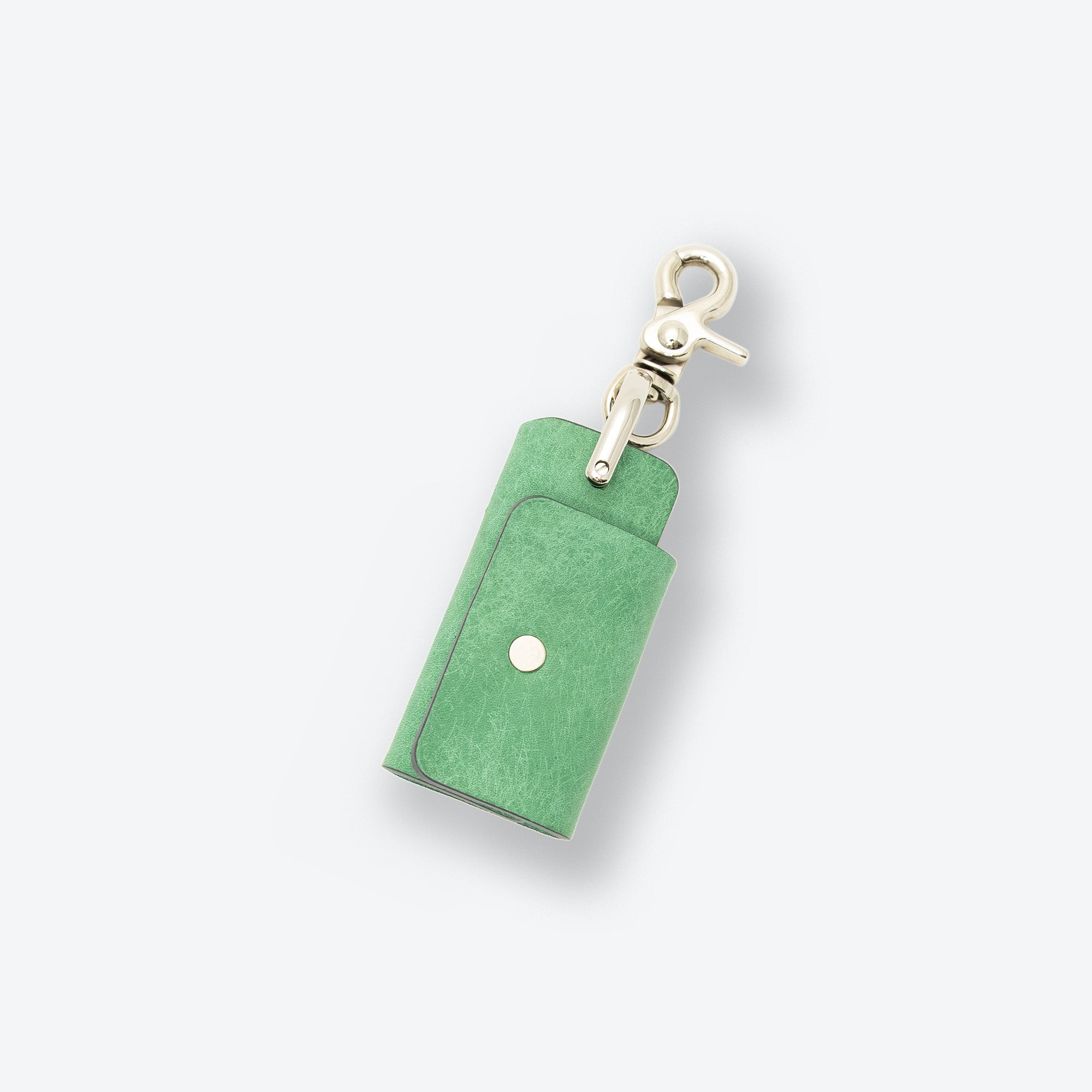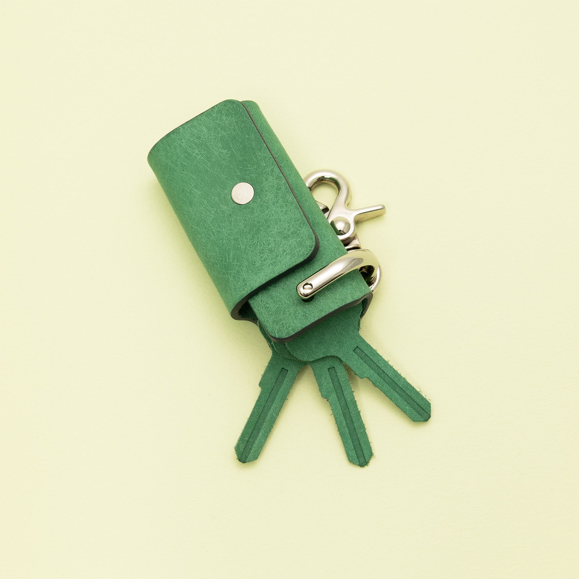「シャックル」と呼ばれる作業現場などで使われている金具を服飾用にアレンジしており、ネジ棒に鍵を通して1枚の革で包み込む構造になっています。様々な場所に取り付けができるようにナスカンフックもついています。一般的なサイズの鍵で約4本程度装着できます。今までにない驚くほどに小さなキーケースです。