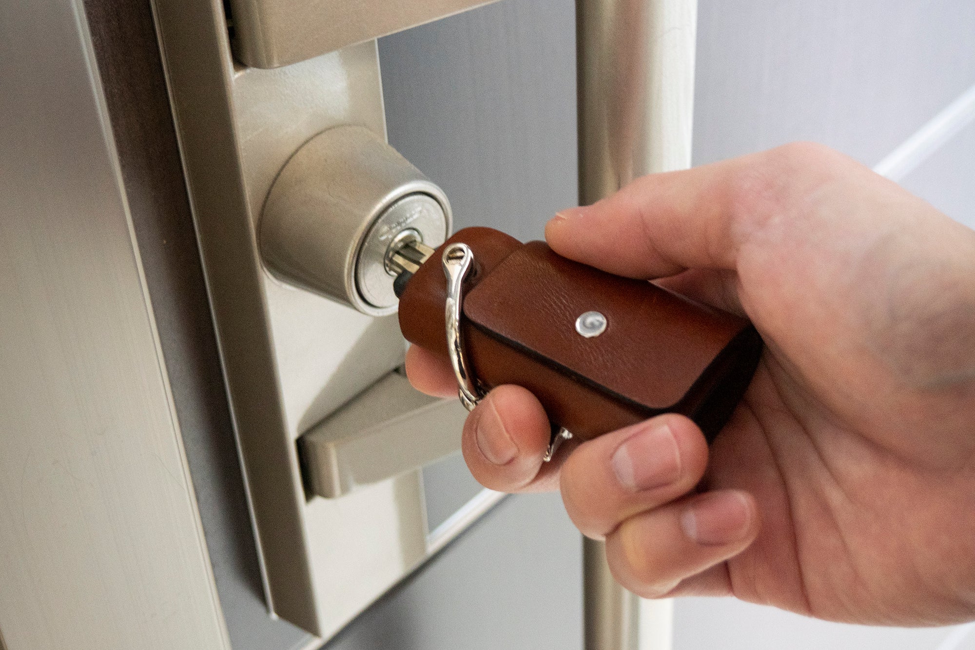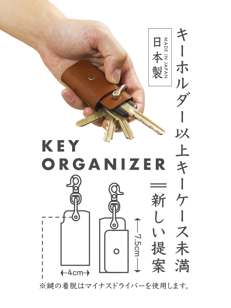 脱着に必要なマイナスドライバーは付属しております。重厚な厚みの革を贅沢にそのまま使用しているのでほどよい重厚感があり、所有欲を満たしてくれます。本革で作ったキーチャーム付属が3本付属しており、鍵同士の接触音を抑える緩衝材としてお使いいただけます。
