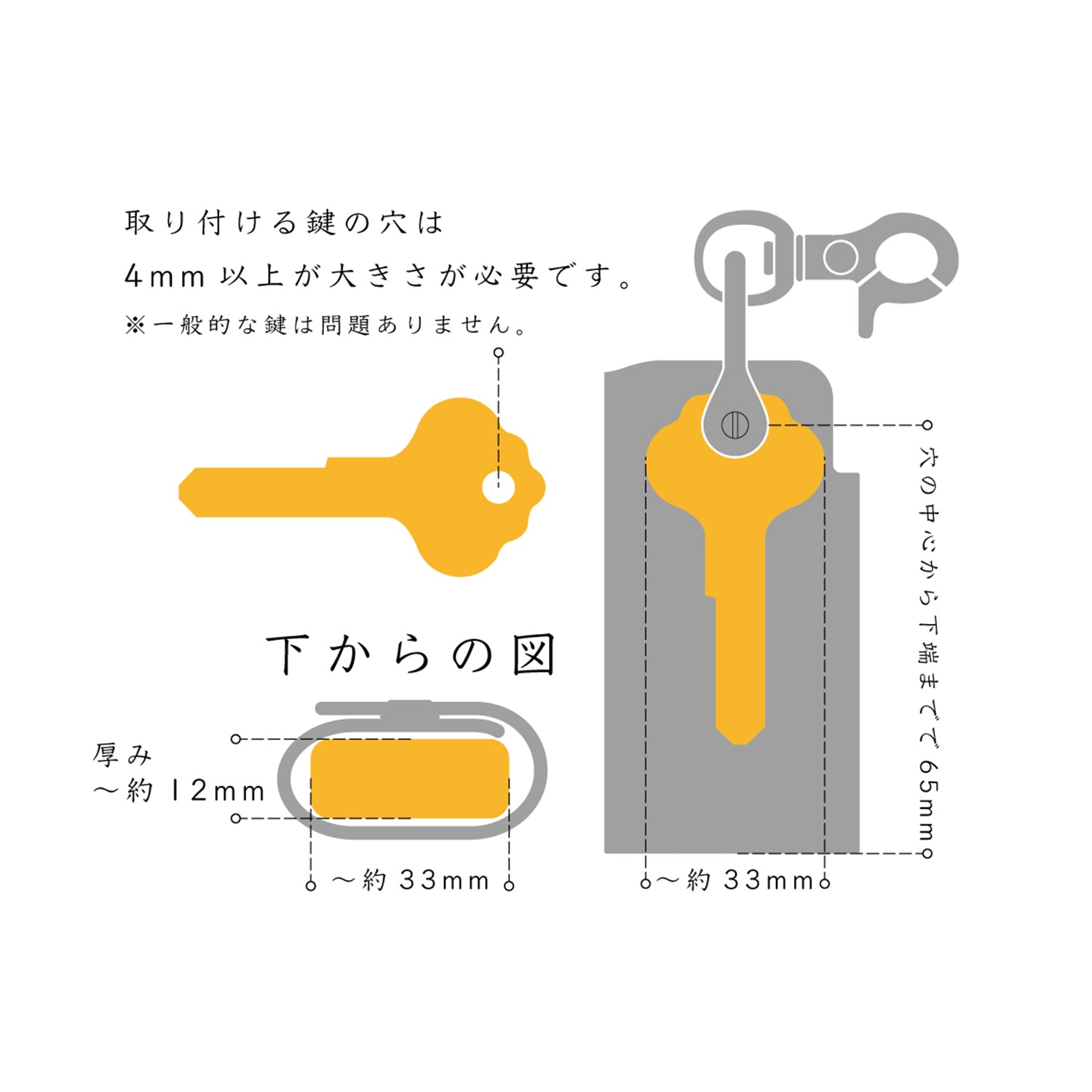 対応鍵穴のサイズは3mm以上となります。3mm以下を装着の場合ネジが緩みやすくなりますのでご注意ください。数ヶ月毎にマイナスドライバーで増し締めを推奨しております。フック部品は合金にシルバーメッキが程されております。メッキ加工は金具が噛み合わさる箇所にメッキが入り込まない為、金属本来の黒〜銅色っぽく見える箇所がございます。錆でなく使用には問題ございません。シャックルは真鍮金具にシルバーメッキが施されておりますが加工特性上メッキがかからない部分がございます。