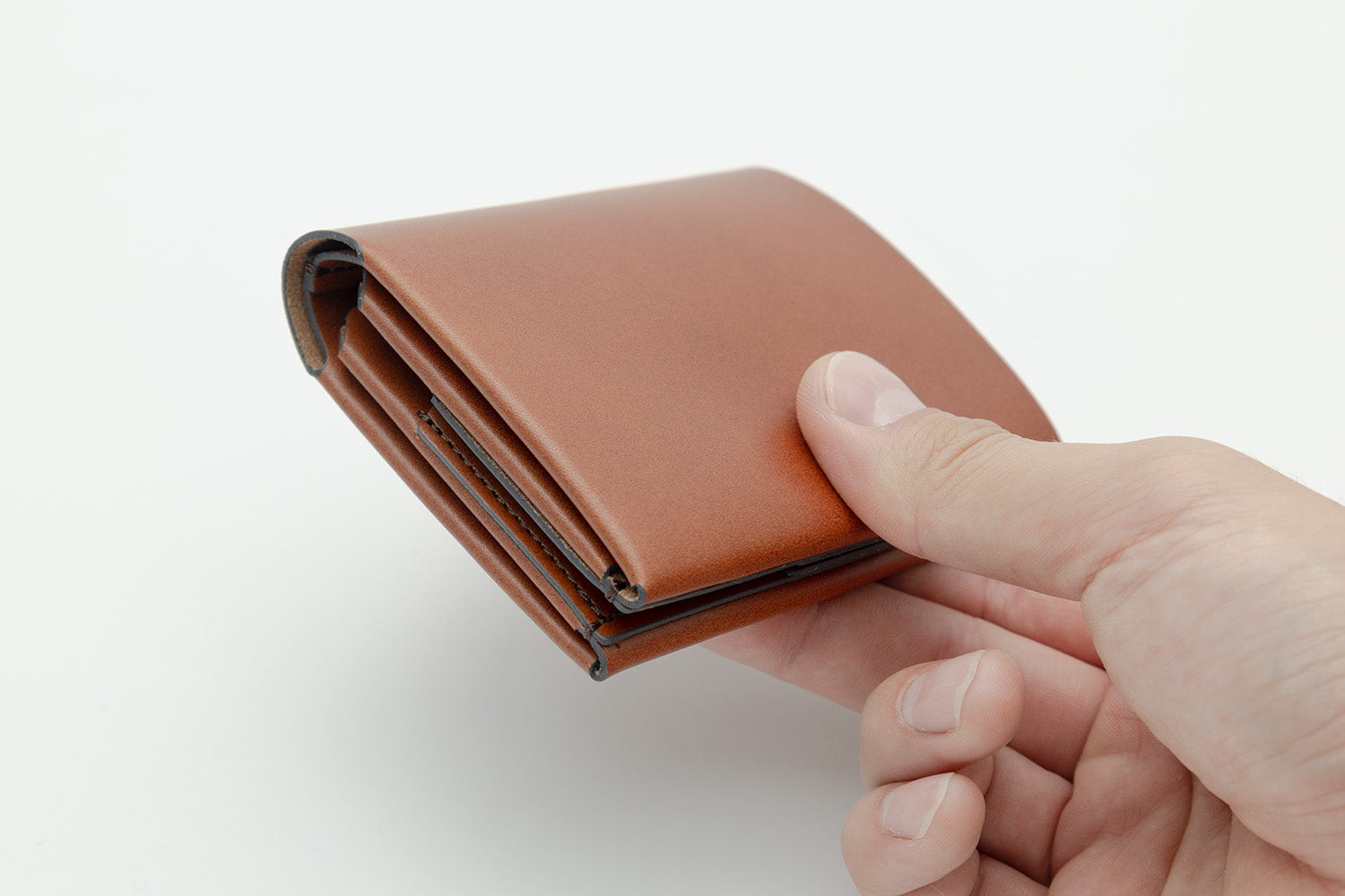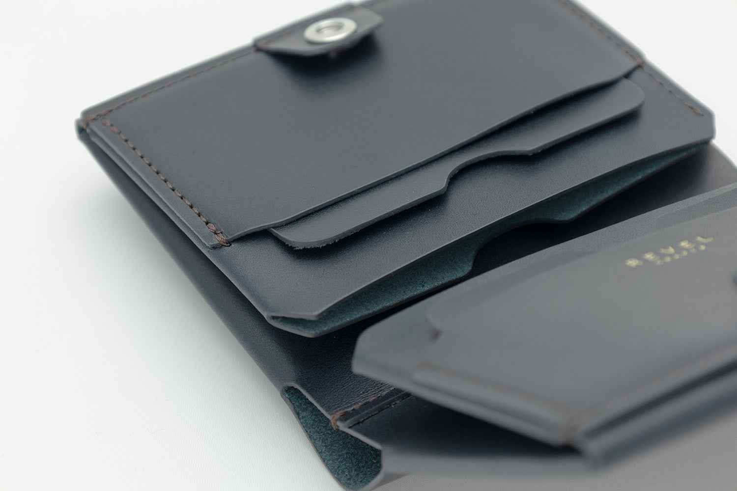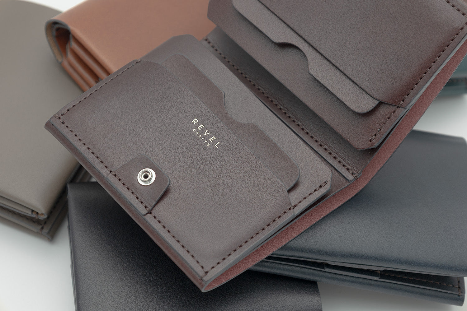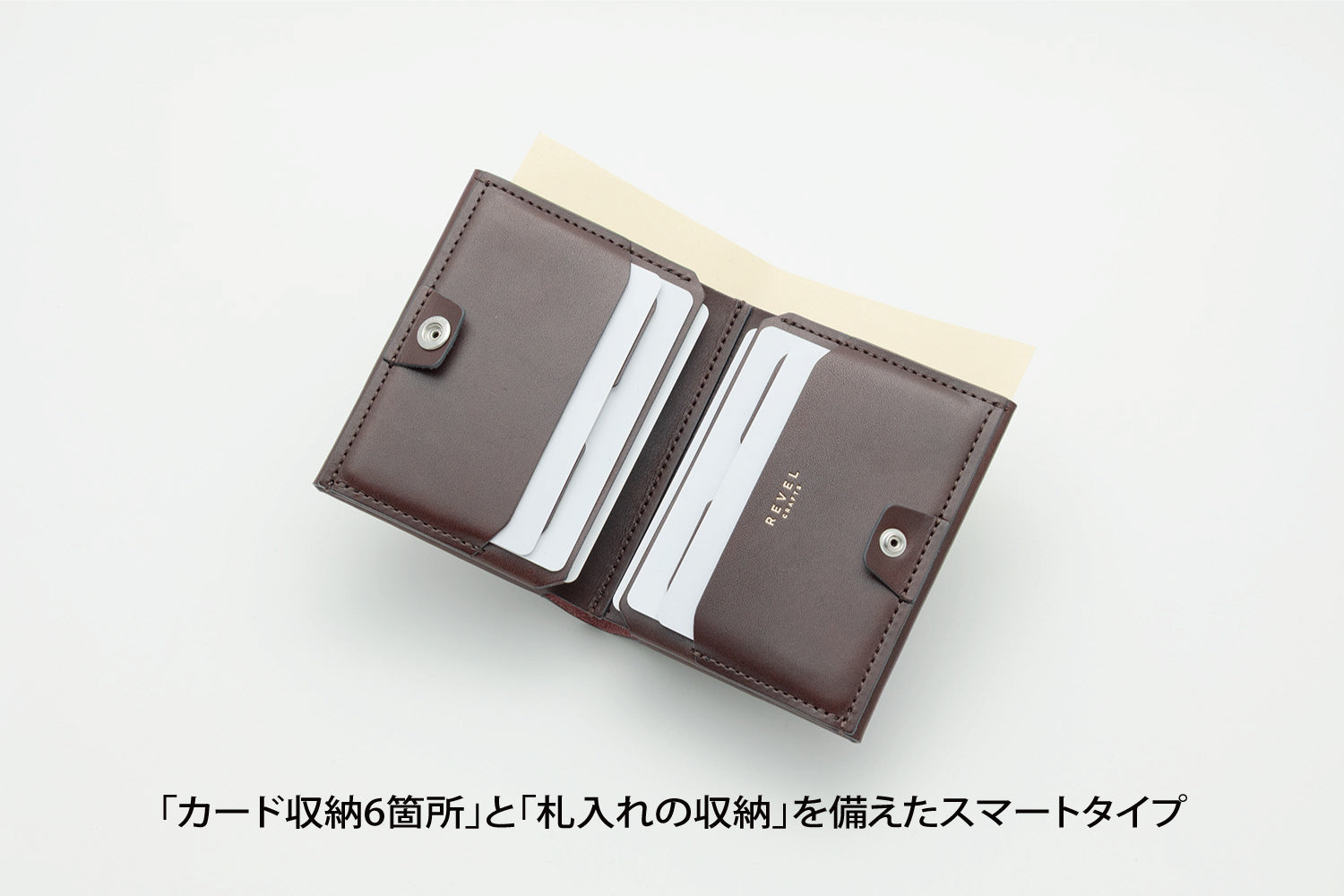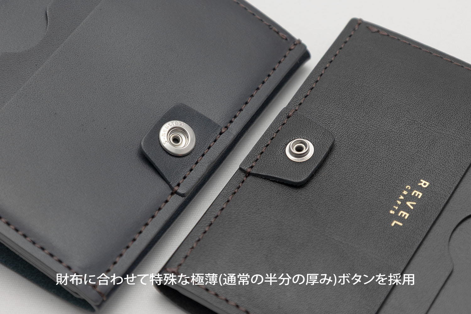 REVELの使用しているすべての革素材は使うほどに革が馴染んで丸みが出てきて財布自体が薄くなってきます。長くお使いいただけましたらよりスマートに感じていただけます。